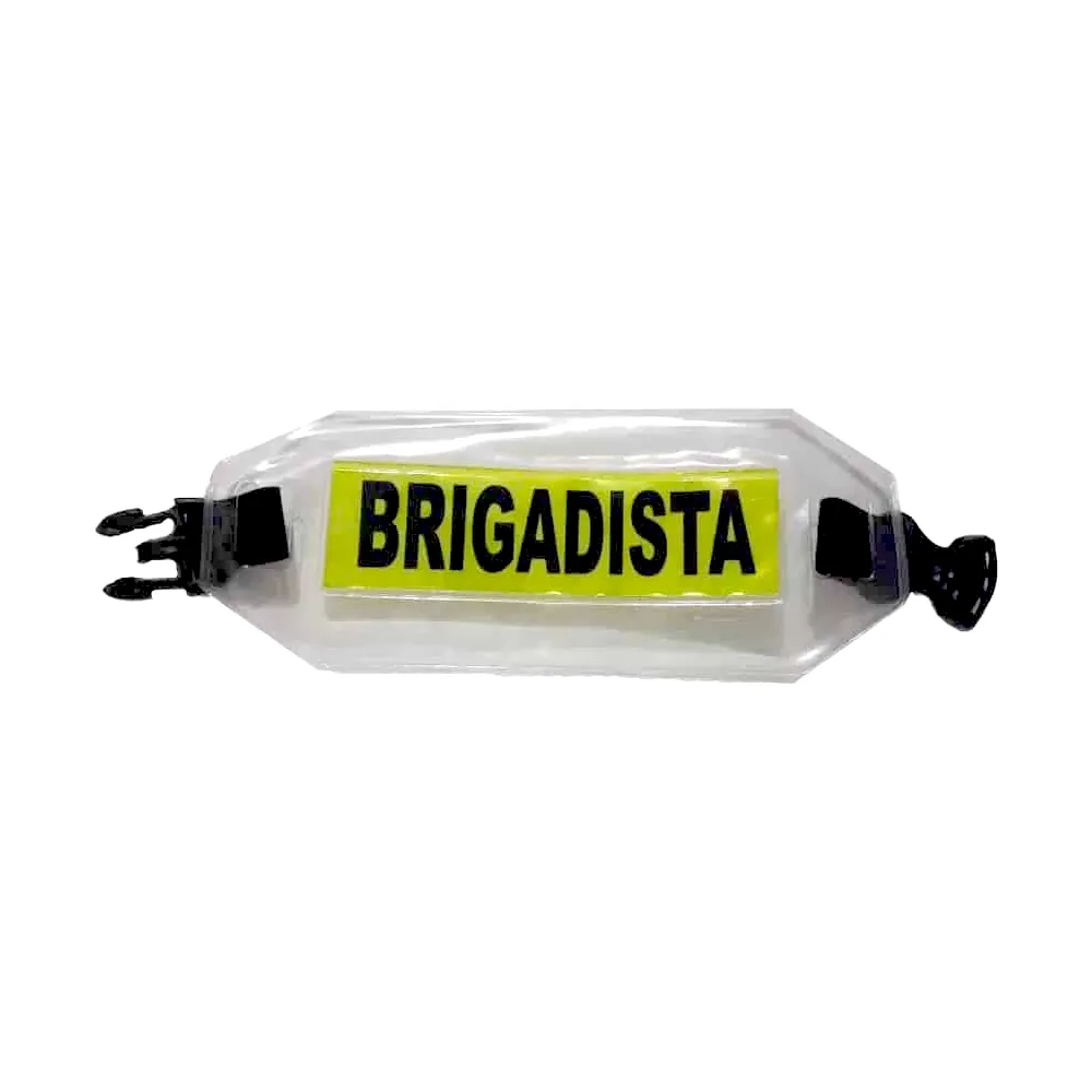 - Brazalete brigadista en vinilo transparente con letras negras y fondo reflectivo.