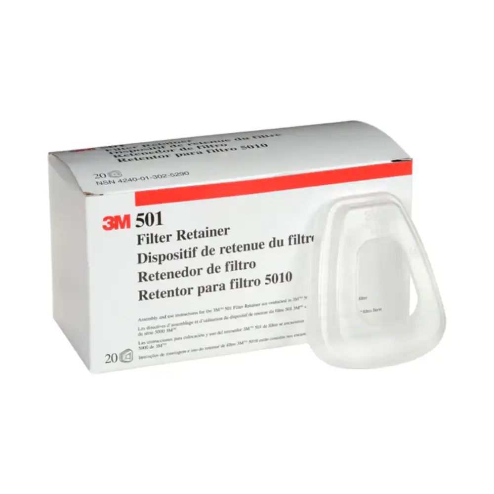 El retenedor 3M 501 es usado para acoplar y asegurar los filtros 5N11 en la parte superior de los cartuchos 3M de la serie 6000. En conjunto con el filtro 5N11 y los cartuchos de la serie 6000 brinda una efectiva e higiénica protección respiratoria contra polvos y partículas líquidas sin aceite, gases y vapores. Puede ser usado en : Triturado, Lijado , Aserrado Carpintería ,Empacado Aprobaciones ,Cementos Construcción , Minería Alimenticia, Pintura en spray.