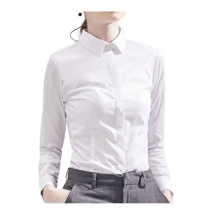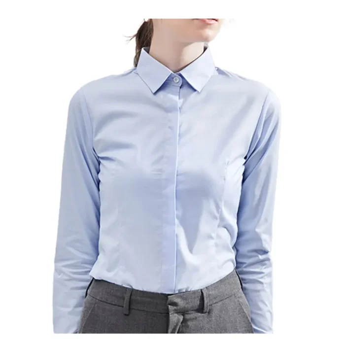 Camisa oxford dama , cuello camisero pespunte sencillo, manga larga con portañuela en punta , pieza con 4 puntas estilo princesa .